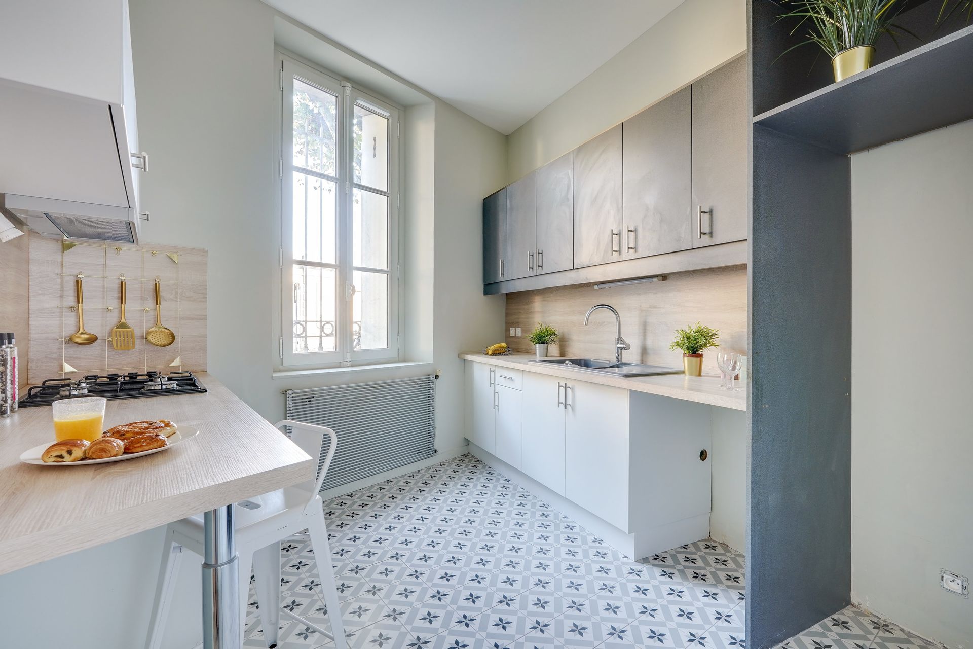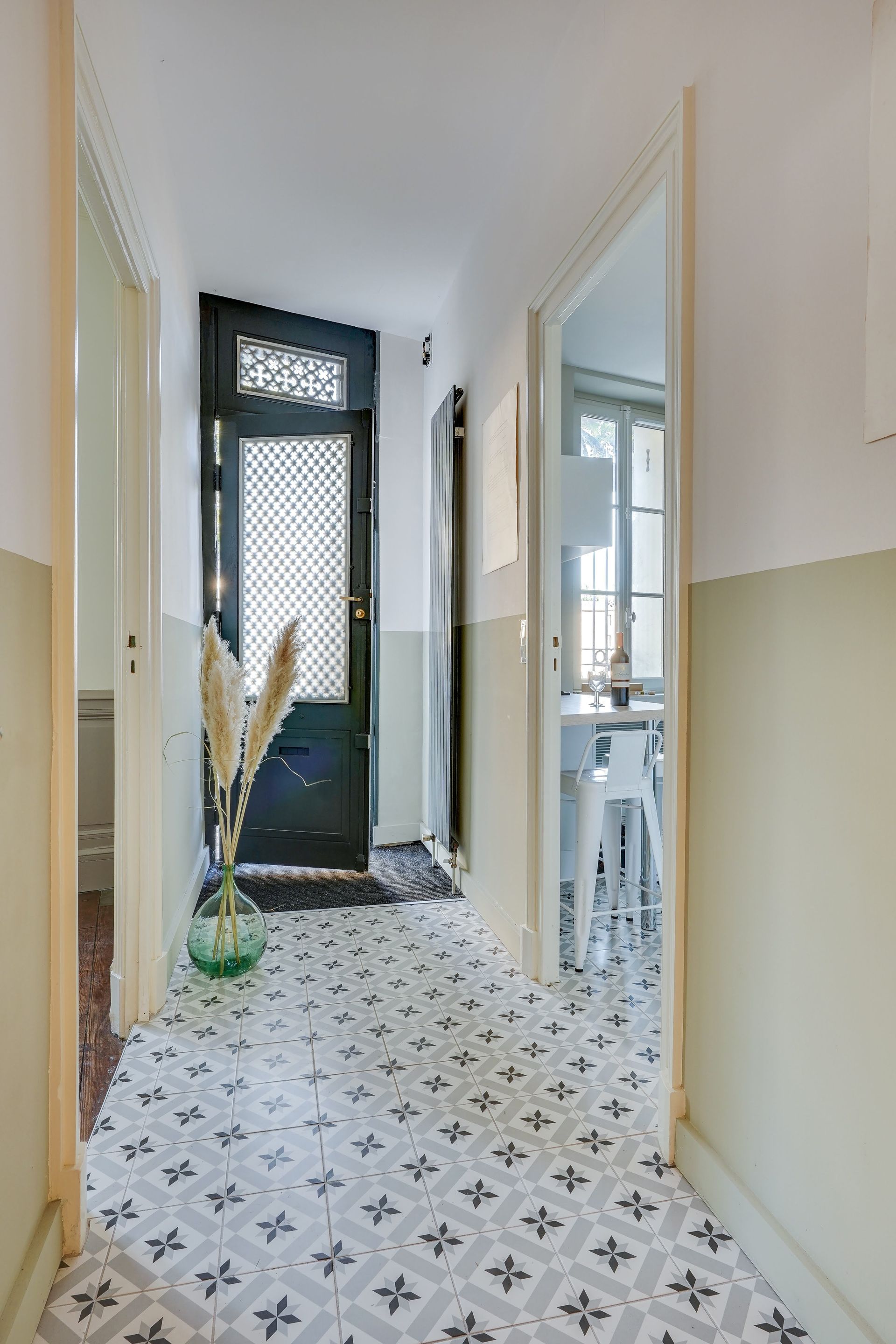Nous les avons accompagnés dans le choix des matériaux et des couleurs, privilégiant des éléments authentiques, tels que des parquets en chêne, des moulures restaurées et des teintes douces, qui rappellent le charme d’antan. La conception de la cuisine a été entièrement repensée pour répondre aux exigences contemporaines tout en conservant une esthétique intemporelle, avec des matériaux nobles et un agencement fluide.