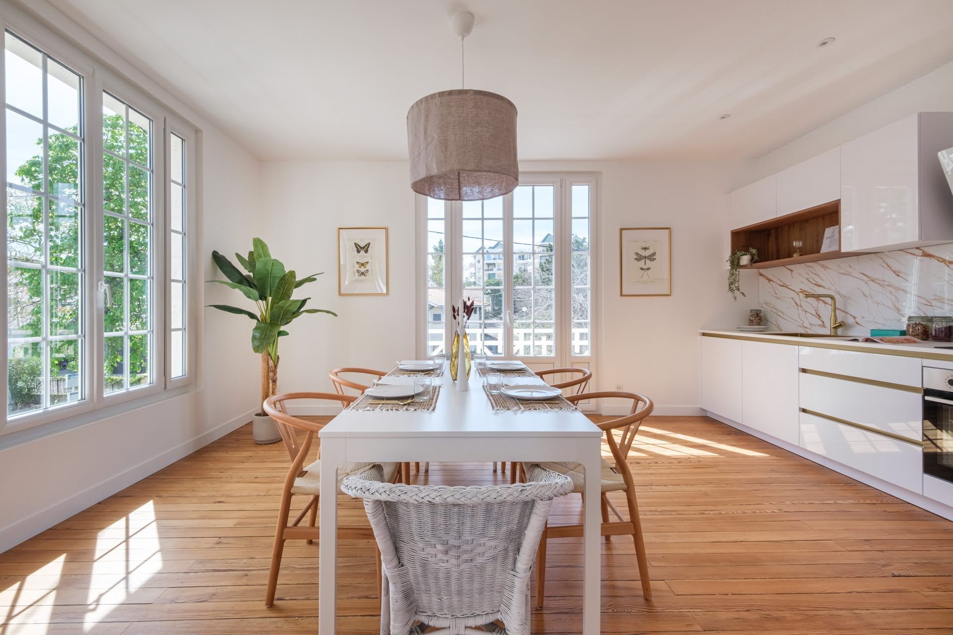 Cette grande maison baignée de lumière, située en plein centre d'Arcachon, a été fraichement rénovée par nos clients. Pour la commercialisation ils nous ont confié la mission de réaliser un Home Staging pour meubler et aider la projection lors des visites sur une majeure partie des pièces de la maison.