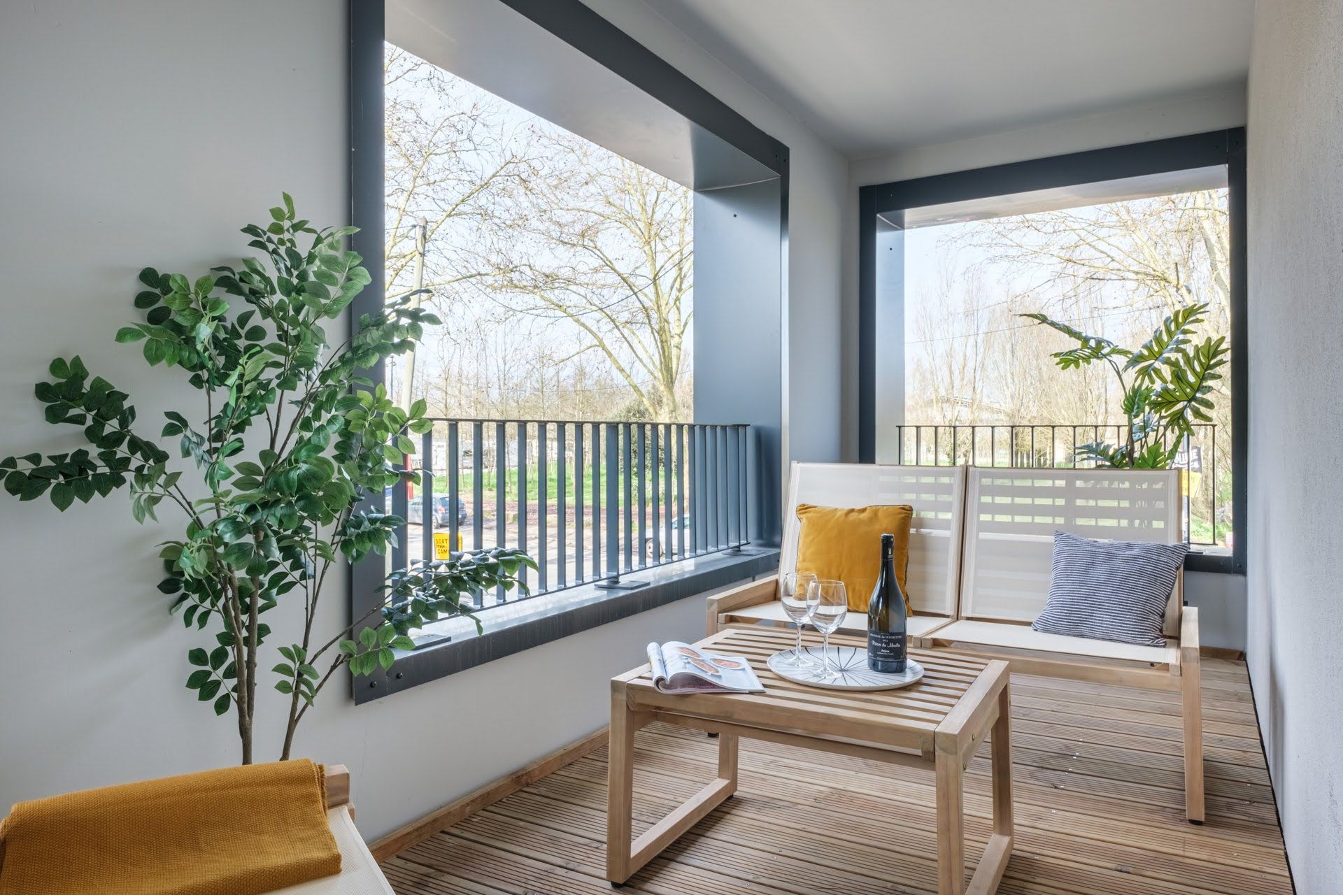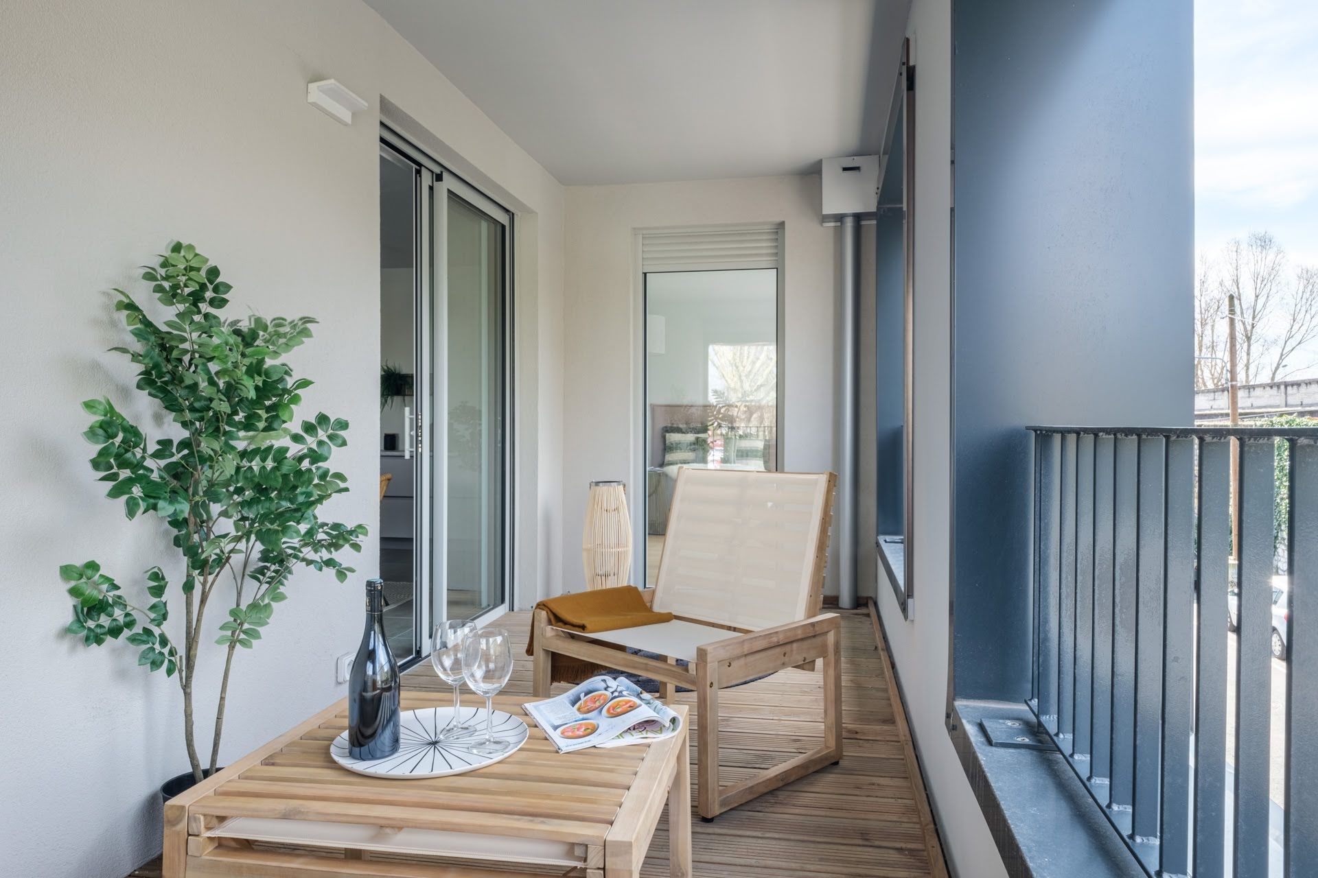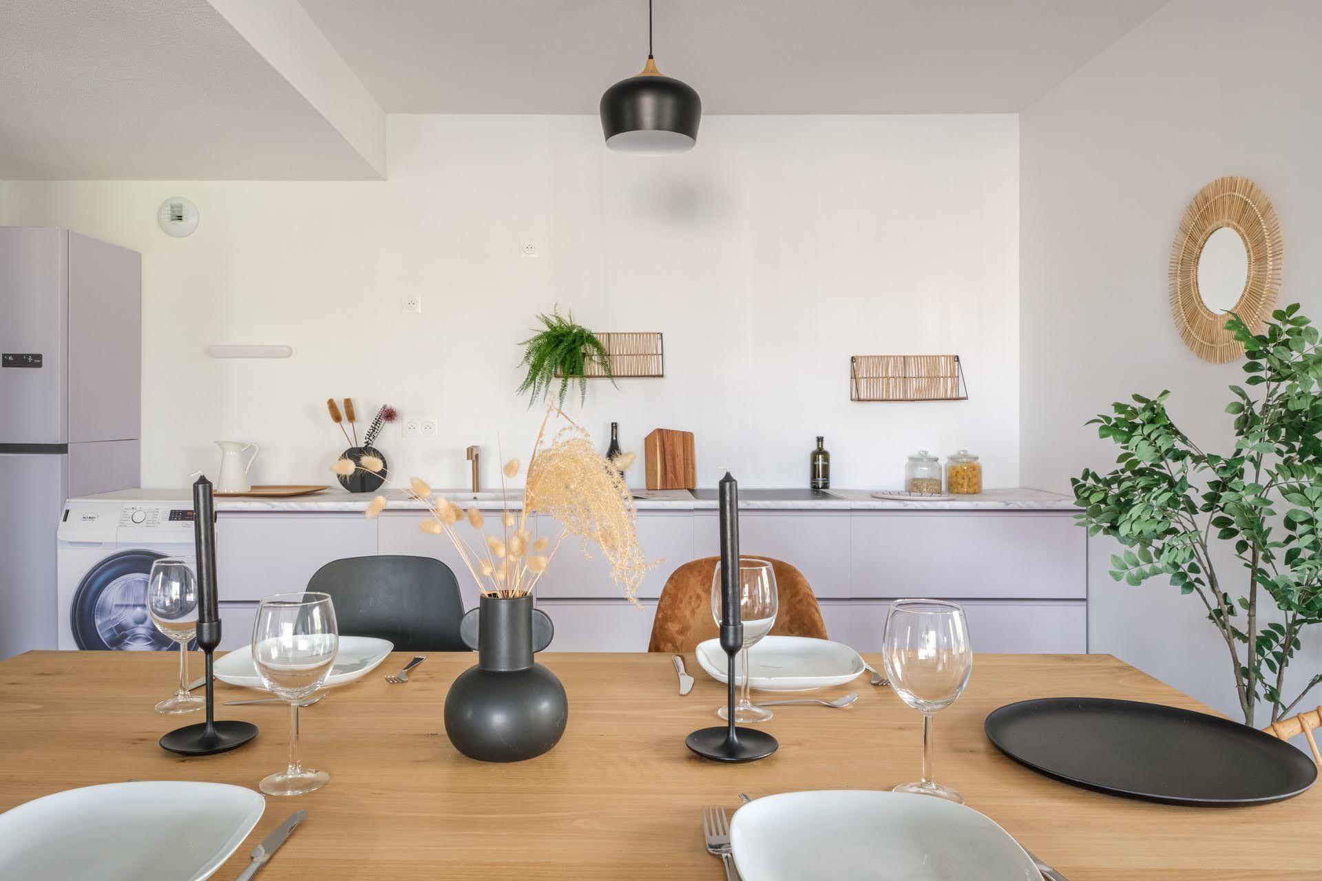 Nous avons apporté une solution de cuisine factice et un ameublement complet des pièces de l'appartement, ainsi que de la terrasse, communiquant avec la chambre parentale.